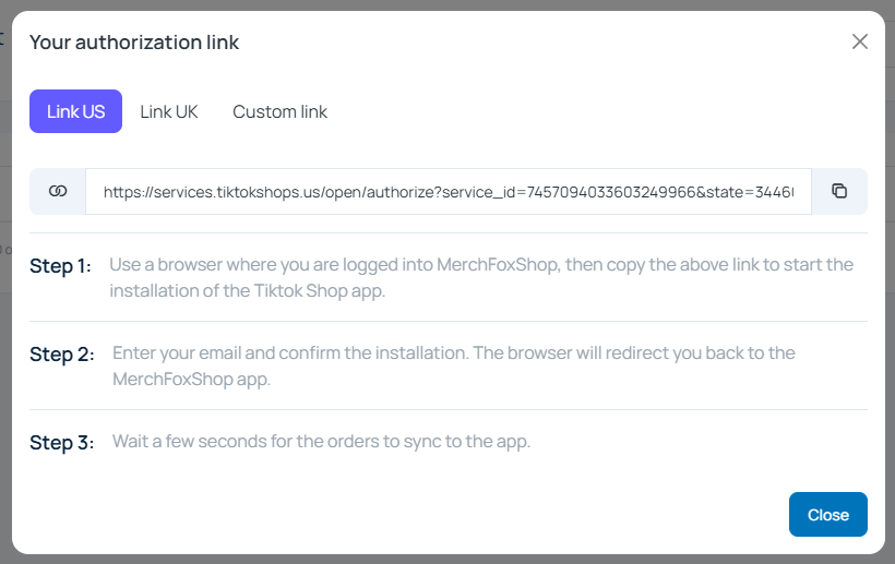 Step 1 — Using a browser where you are already logged into MerchFox.Shop, copy the provided authorization URL and open it in the same browser to initiate the TikTok Shop app installation