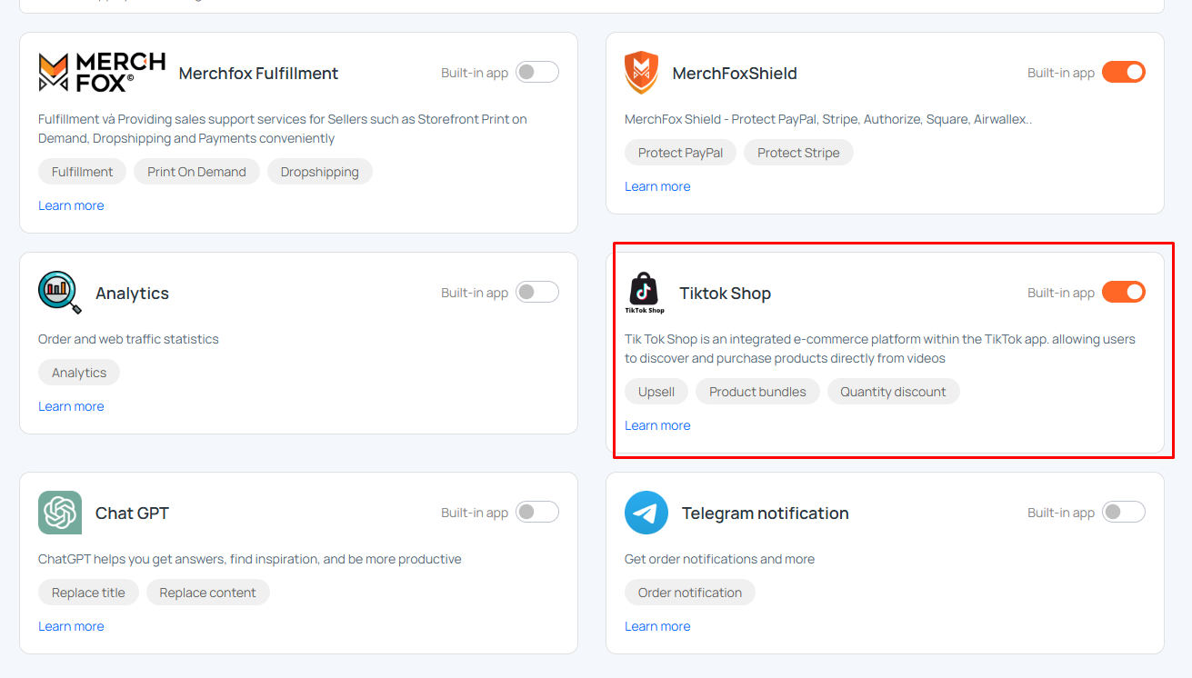 MerchFox.Shop supports native integration with TikTok Shop, enabling merchants to connect their TikTok Shop accounts, sync products, and manage orders directly from the MerchFox dashboard.